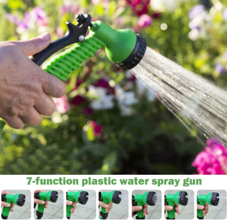 1. Juego de tuberías: 1 soporte de plástico, 1 tubería de PVC de tres capas de 10 m y 3/8", 1 pistola pulverizadora de plástico con 7 funciones, 2 conectores rápidos de plástico de 3/8", 1 conector de grifo de plástico de 1/2" y 3/4".